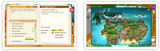 Barnet blir ledsaget fra starten av. Etter at barnet har fått presentert og forklart reglene for oppførsel, får barnet ditt sammen med superjournalistene Max og Ella, Panfu sine hovedkarakterer, en liten rundtur på Panfu. Under denne turen vises raskt, informativt og lekent de viktigste funksjonene, de første oppgavene og hvordan man samhandler med andre. I alle oppgavene kommer det spesialkarakterer for å hjelpe barna, som f.eks troll- og spåkvinnen Kamaria, oppfinneren Professor Bookworm, den hjelpsomme bygningsarbeideren Manny, dyreaktivisten Eloise og mange andre. Ved å fullføre den første oppgaven, får barna et innblikk i spillet på Panfu. Ukentlig arrangementer på Panfu utvider spillet, små animasjoner (flygende fugler, bølgesus, osv.) gir Panfu en naturtro atmosfære.