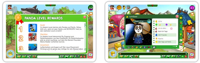 For å gjøre spilleopplevelsen på Panfu enda bedre, tilbys et barnevennlig belønnings- og nivåsystem. Når de har klart å gjennomføre en oppgaver kan spillerne få nye klær eller møbler, mynter eller spesielle gjenstander. Dessuten kan spillerne hele tiden nå nye nivå. Barna kan se på profilen hvilket nivå de befinner seg på.